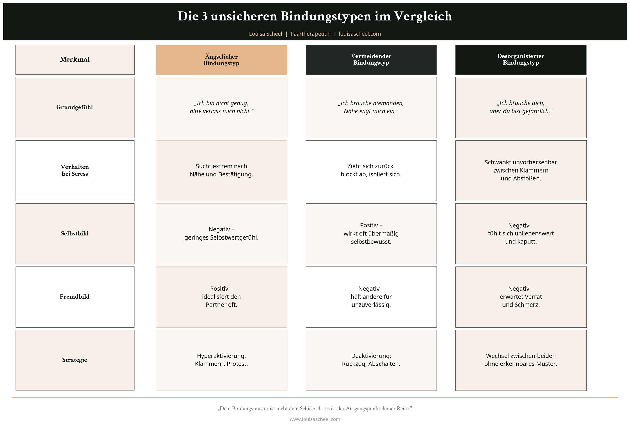 Trifft ein desorganisierter Mensch auf einen ängstlichen Partner, kann dessen ständiges Bedürfnis nach Nähe und Bestätigung erdrückend wirken und den Fluchtinstinkt auslösen. Trifft er auf einen vermeidenden Partner, bestätigt dessen emotionale Distanz die tiefe Angst vor Ablehnung. Oft fühlen sich ängstliche und desorganisierte Menschen paradoxerweise zu vermeidenden Partnern hingezogen, weil diese das vertraute Gefühl der emotionalen Unerreichbarkeit aus der Kindheit widerspiegeln. Lies dazu auch meinen Artikel: Warum ängstliche Menschen vermeidende Partner:innen wählen.